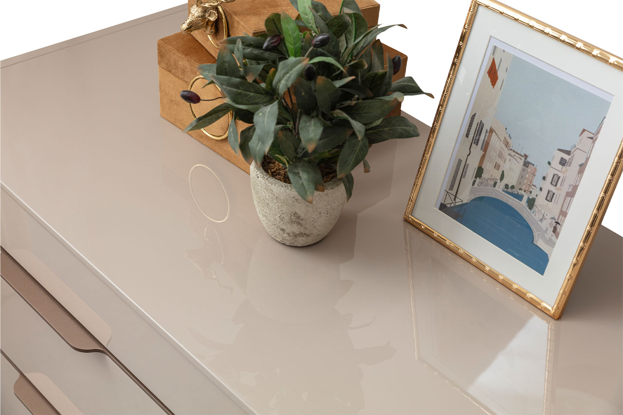 Fonksiyonel şifonyer, ayna ve komodin detaylarıyla tamamlanan takım; ince işçiliği, parlak yüzeyleri ve göz yormayan renk geçişleriyle dikkat çeker. Konforu ve şıklığı bir arada sunan Magna, yatak odanızı adeta bir yaşam alanına dönüştürür.